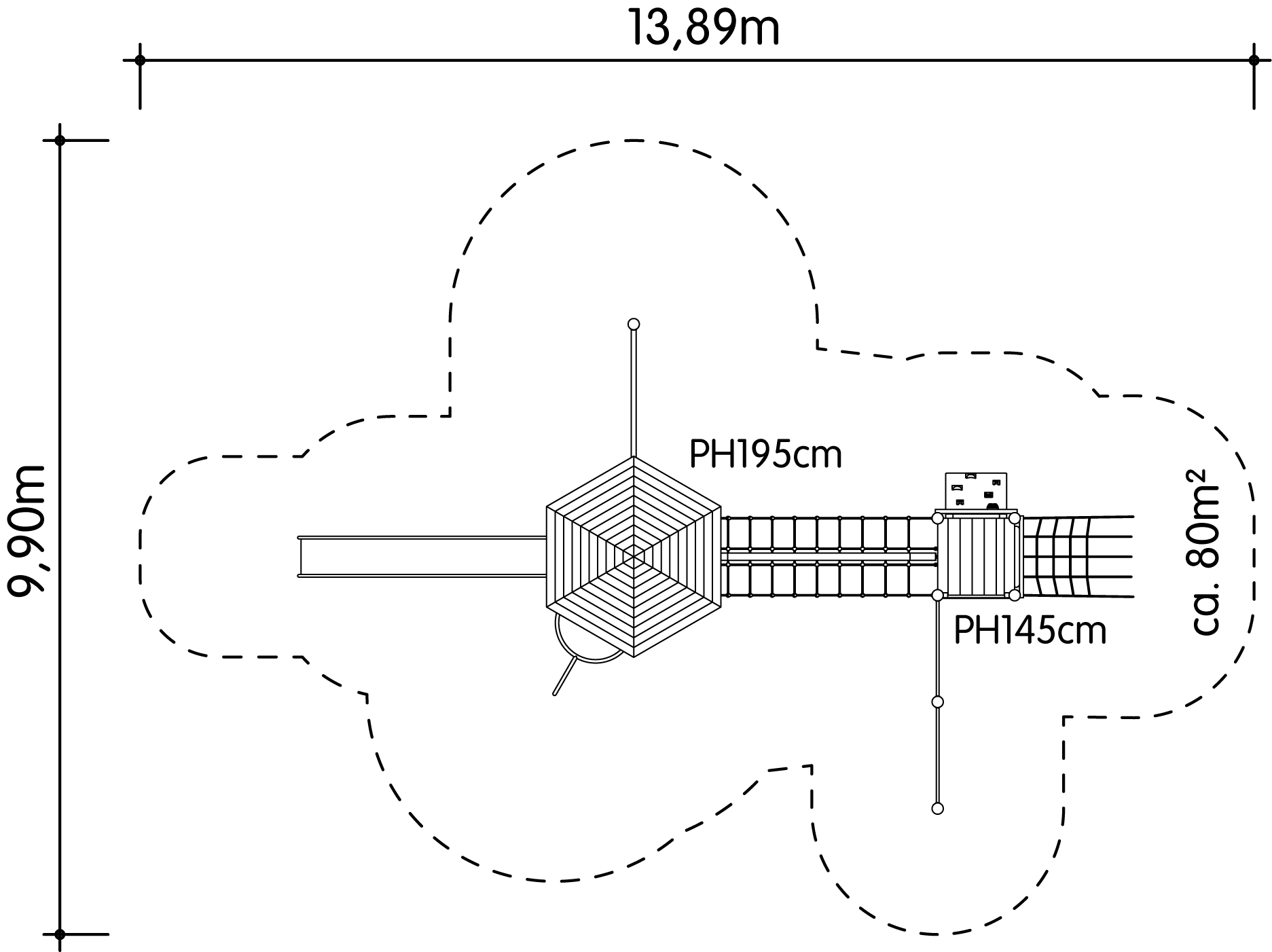 | Sicherheitsbereich mind.: | 1389 cm x 990 cm / 80 m² |