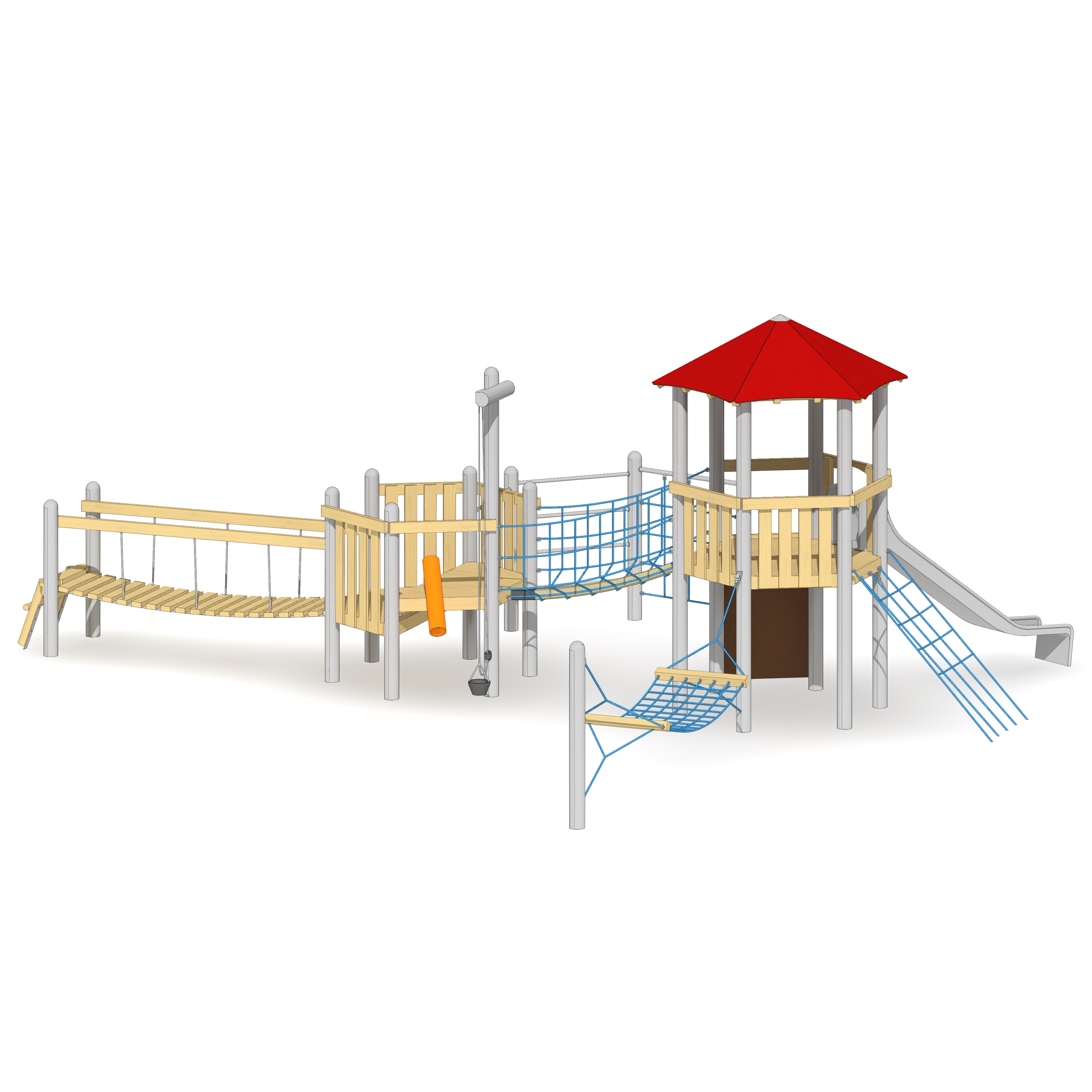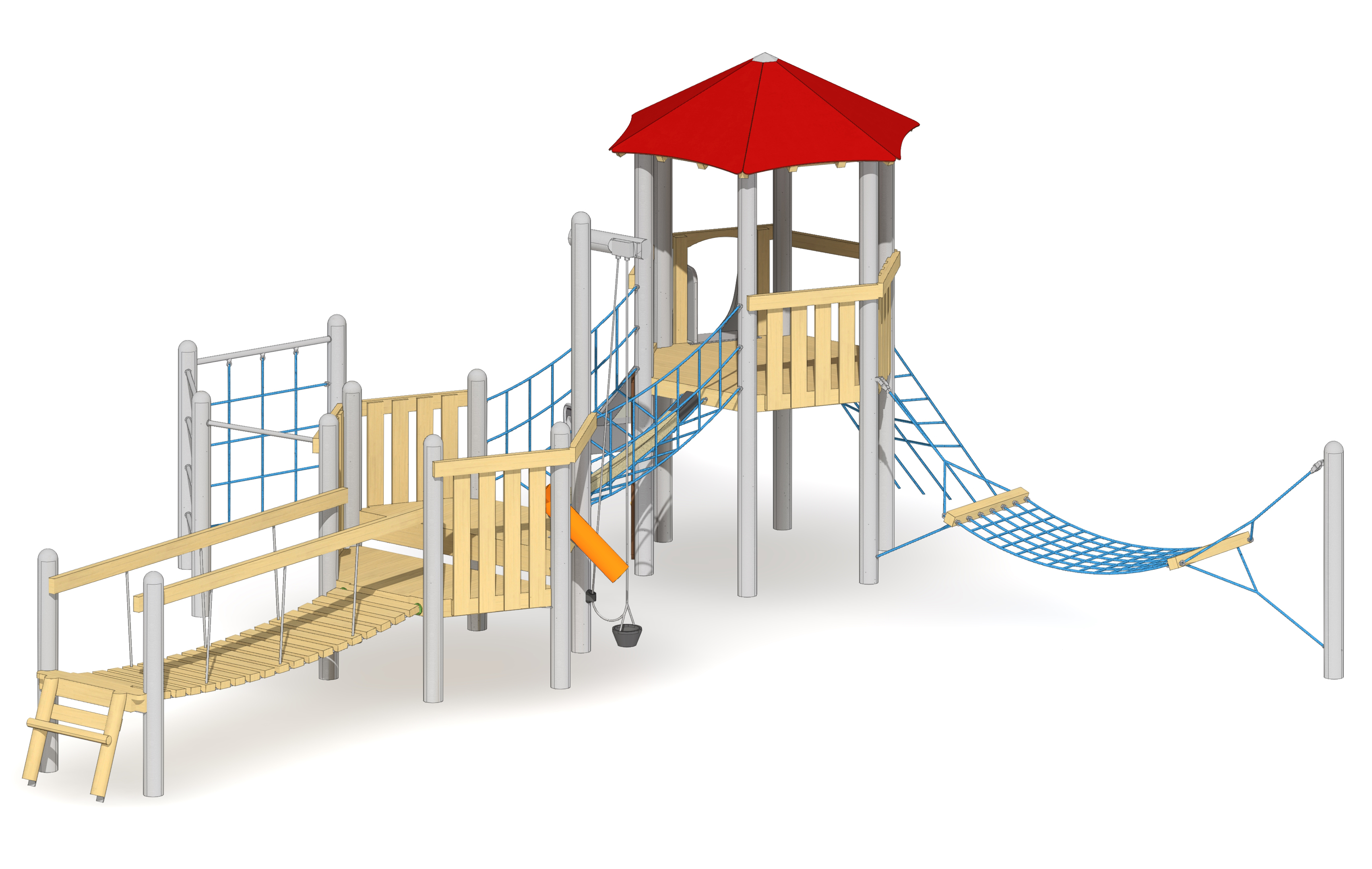 Balanciergeräte, balancieren, Brücke, Hängematte, Klettergeräte, klettern, Podeste, Balkon, Plattform, Rutsche, rutschen, Sandspiel, Turm, Türme, Turngeräte, turnen