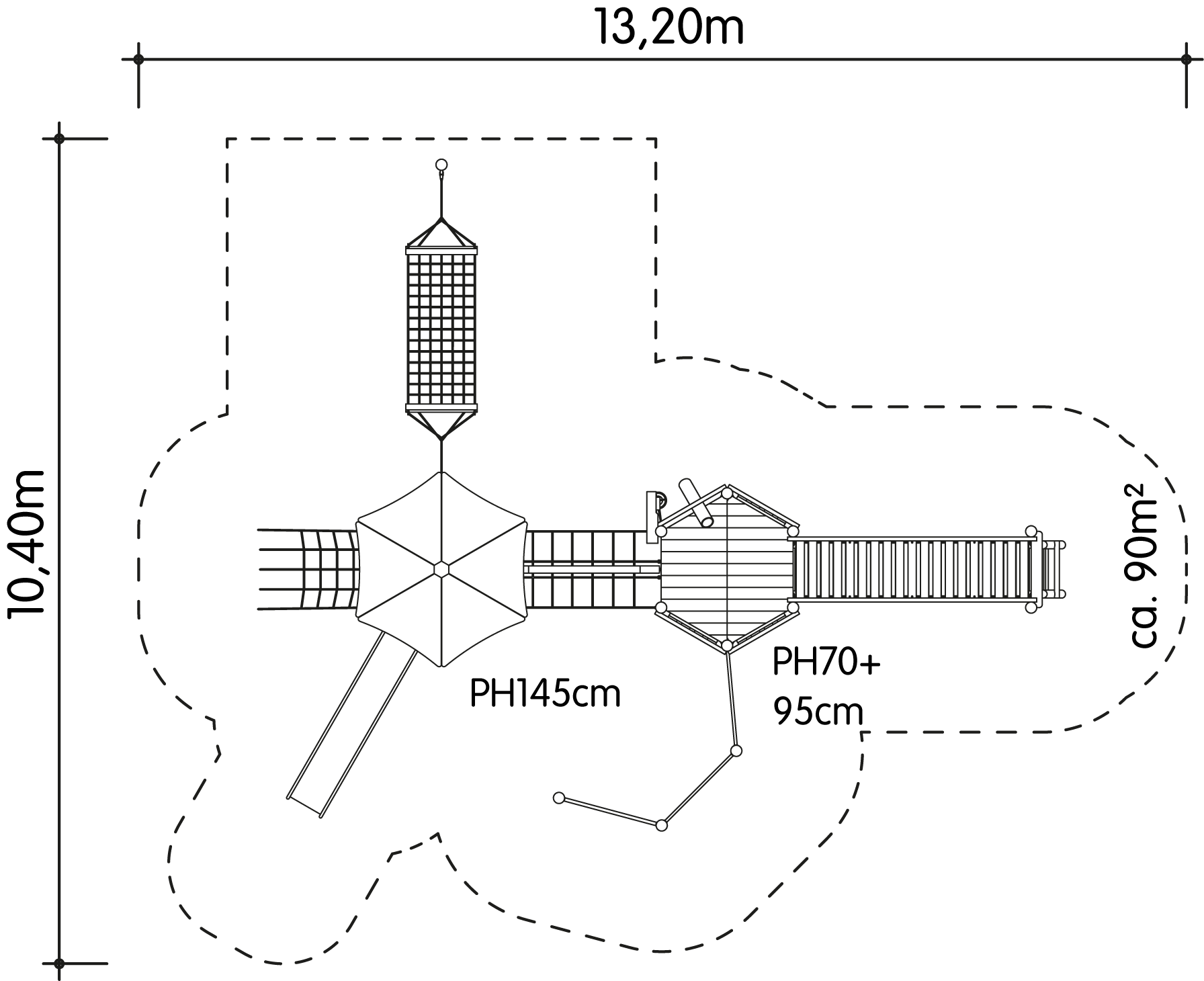 | Sicherheitsbereich mind.: | 1320 cm x 1040 cm / 90 m² |