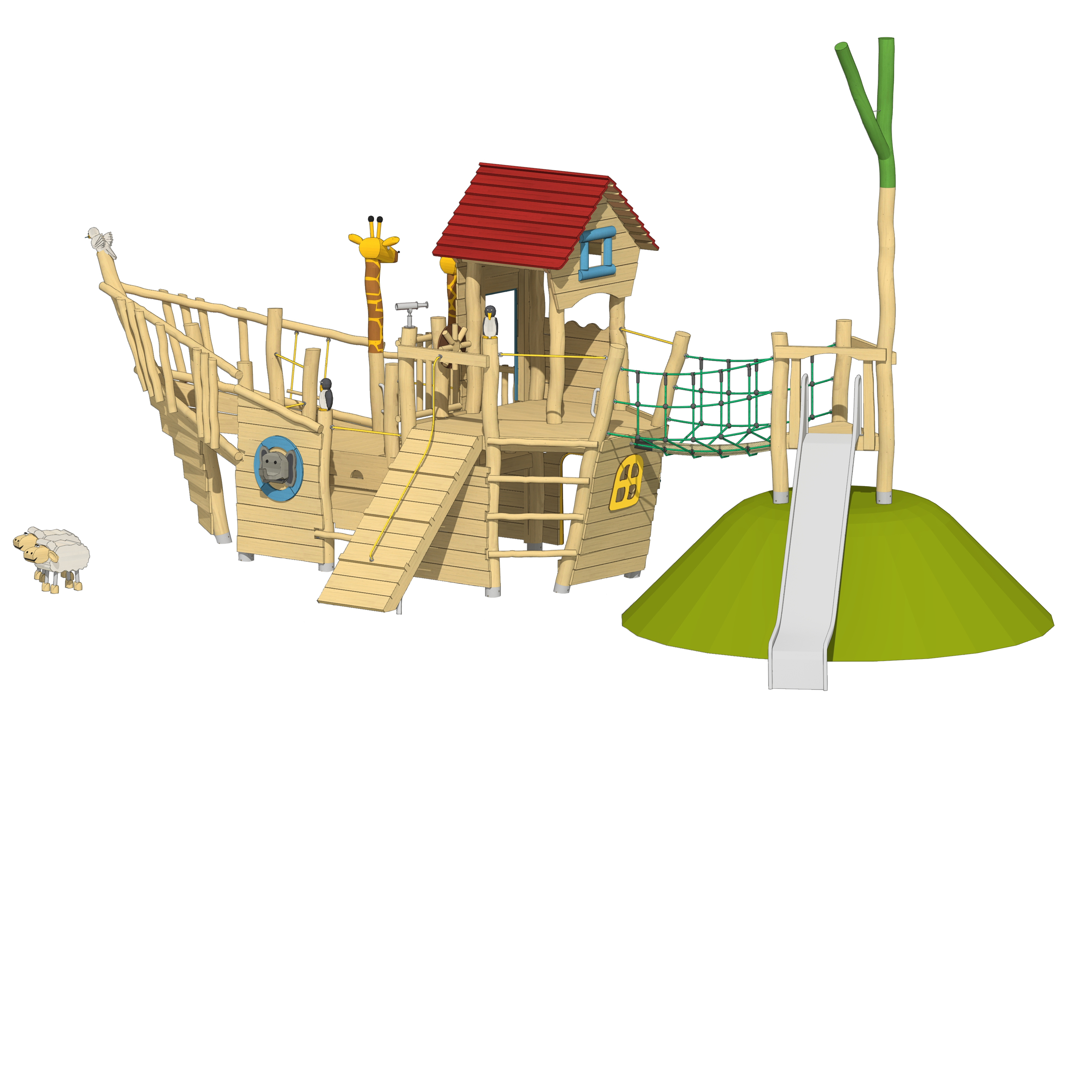 Balanciergeräte, balancieren, Brücke, Klettergeräte, klettern, Podeste, Balkon, Plattform, Rollenspiel, Rutsche, rutschen, Seil, Seilspiel, Sitzgelegenheit, Tische, Bänke, Turm, Türme, Versteck, verstecken