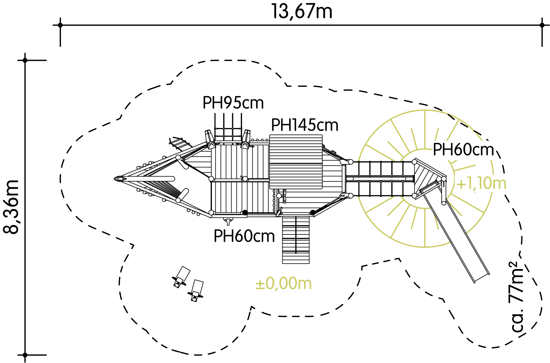 | Sicherheitsbereich mind.: | 1367 cm x 836 cm / 77 m² |